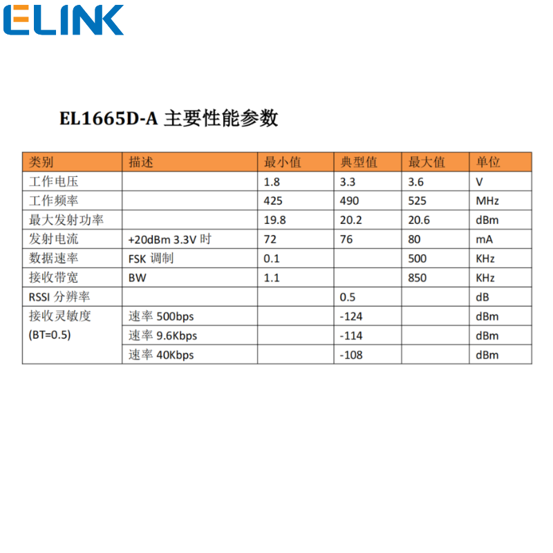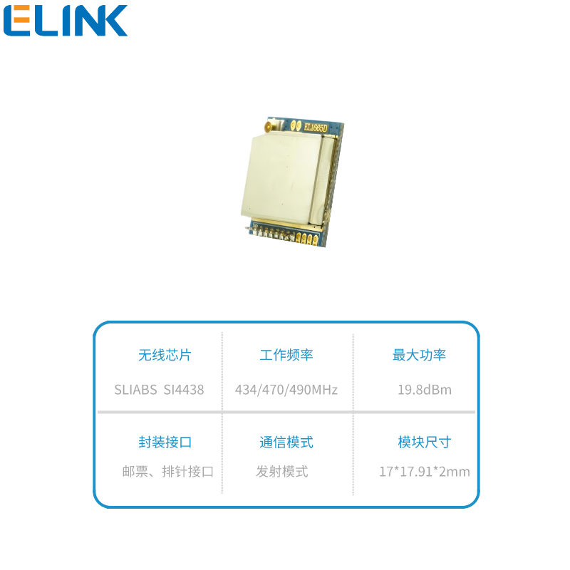 EL1665D-A 是一款采用 SI4438 內核設計的輸出功率為 100mW 的高性能 無線收發(fā)通訊模組。工作頻段為 425MHz~525MHz,默認頻段為 490MHz。 EL1665D-A 是高性能低電流的 425MHz~525MHz 收發(fā)模組,采用 SI4438 內核設計,包括完整的發(fā)送器和接收器。接收靈敏度為-124dBm,最大輸出 功率+20dBm,支持(G)FSK,OOK 調制方式,數(shù)據(jù)速率從 100bps~500Kbps,工作 電壓 1.8V~3.6V,關斷電流 30nA,待機電流 50nA。主要應用在遠傳抄表 (802.15.4g & MBus)、遙控、家庭安全和告警、車庫和大門開啟、遙測、家 庭自動化、傳感器網(wǎng)絡、健康監(jiān)視等。