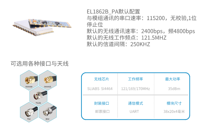 EL1862B_PA具有尺寸小,功率大,靈敏度高,傳輸距離遠(yuǎn),通訊數(shù)率高,在無線速率2.4kbps下通訊距離在空曠地實(shí)測距離15公里以上,內(nèi)部自動完成通訊協(xié)議轉(zhuǎn)換和數(shù)據(jù)收發(fā)控制等特點(diǎn)。